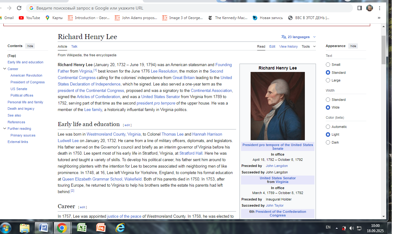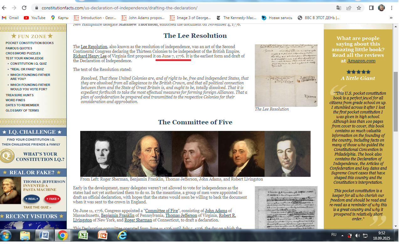 "Первоначально делегаты настаивали на том, чтобы автором Декларации независимости был Ричард Генри Ли , автор «Резолюции Ли», а не Джефферсон. Однако обстоятельства изменили ход истории. Во-первых, Ли был назначен в Комитет Конфедерации для написания Статей Конфедерации и посчитал, что участие в обоих комитетах потребует слишком много усилий. Во-вторых, его жена тяжело заболела во время Филадельфийского съезда, что вынудило его преждевременно вернуться домой.