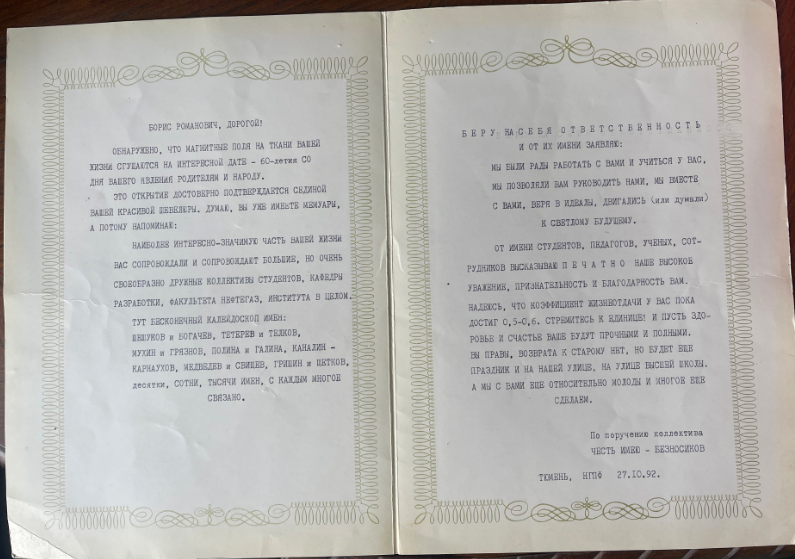 Поздравление с 60-летием 27 октября 1992 года моему отцу Ярославову Борису Романовичу к.г.м.н., доценту кафедры Разработка нефтяных и газовых месторождений от декана нефтегазового факультета Тюменского индустриального института и коллектива кафедры Разработка и эксплуатация нефтяных и газовых месторождений Тюменского индустриального института. К этой дате 27 октября 1992 года мой отец Ярославов Борис Романович 20 лет с 1972 года работал доцентом кафедры Разработка и эксплуатация нефтяных и газовых месторождений Тюменского индустриального института ТюмИИ.